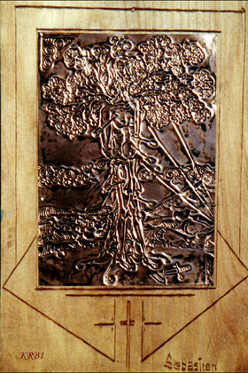 13/28 | Saint Sébastien Gravure sur cuivre repoussé, patinée à l'ancienne puis clouée sur une planche de bois. Saint Sébastien, attaché à un arbre est percé de multiples flèches cependant son regard se porte toujours vers Dieu. Les gravures sont remplies de détails qui se voient peu sur les photos en couleur. Pour plus de lisibilité, vous pouvez consulter les photos en noir et blanc et dans le meilleur des cas en acquérir une (ou plusieurs). 30 x 22 cm |